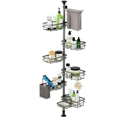 • Includes multiple caddies, a soap holder, and versatile hooks for total bathroom organization.