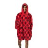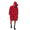 Step into the world of Deadpool with this red hooded blanket featuring an all-over print of the antihero's logo in a striking diamond pattern. The hood is adorned with a graphic of Deadpool's iconic mask for added flair. Made from plush coral faux shearling back fabric, it includes convenient onseam pockets and measures 36" in body length with a 35" bottom opening width. Perfect for cozying up, it's easy to care for by machine washing it on cold with like colors and tumble drying on low heat. Avoid ironing and dry cleaning to maintain its quality.