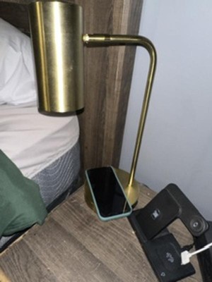 Brighten up your indoor space with this LED Dean Table Lamp from Room Essentials™. Made of metal, this table lamp features a cylinder-shaped shade and a round base that are connected by a single rod in a bronze finish for a stunning look. Designed with a non-removable integrated bulb, this portable table lamp has a touch-activated sensor and one-way light setting for easy operation.