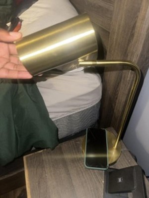 Table light is gold in color. It swivels forward and back but the movement is limited. It has a wireless charging spot. The button to turn the light on is touch so there isn't an actual button.