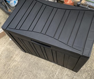 The deck box is sturdy and provides a decent amount of storage. The waterproof design holds up well in rain, and the lockable lid is a nice security feature. Assembly was fairly straightforward, though it took a bit of time. The plastic feels solid but not super heavy-duty — good enough for backyard use, but I wouldn’t sit on it. Overall, it does the job and looks clean on the patio.
