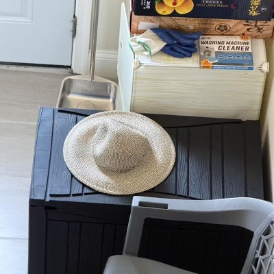 This deck box exceeded my expectations! The material is sturdy and definitely weather resistant, making it perfect for both indoor and outdoor use. I love how versatile it is. I use it to store cushions and garden tools on my patio, and it doubles as a small table during gatherings. The size is just right, not too bulky but offers plenty of storage space. Assembly was super easy took me about 10 minutes following the clear instructions. I also appreciate the sturdy handles and the clean, modern look that blends well with my decor.