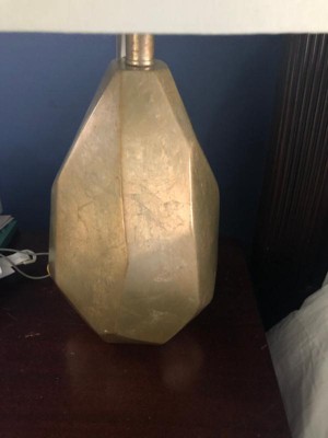 Brighten up your bed side with the Declan table lamp. You will be able to depend on the durability of the poly resin body, and the color of the gold finish will last for quite some time. The metal turn knobs come in brush nickel while the shade features a round, hardback design. Due to lighting and monitor differences, actual colors and finishes may vary slightly from what appears online.
