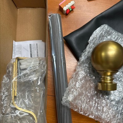 The received item is totally unlike the images. They may have recycled the images but the bar looks like dark-grey painted, textured wood and the finials are golden, not silver. In the image, it looks like a silver metal-look rod with a silver finial. Mounting hardware is also gold-painted.