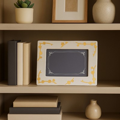 Add a touch of timeless sophistication to your home with the gold picture frame -a stunning blend of floral artistry and elegant craftsmanship. Measuring 7.75 inches long, 1 inch wide, and 9.5 inches high, this decorative frame is perfectly sized to display a 5-inch by 7-inch photo, offering a graceful balance of proportion and design. The intricately sculpted butterfly details, paired with a radiant gold finish, create a frame that feels both luxurious and inviting. Designed for tabletop display, this piece brings subtle glamour to any space, whether placed on a console table, nightstand, dresser, or office desk. Each is beautifully molded to catch light and shadow, making the frame shimmer from every angle. The smooth polyresin body offers durability with a refined texture, ensuring your cherished family portraits and travel photos remain beautifully preserved for years to come. The neutral gold tone complements a wide range of picture frames, pairing perfectly with gold picture frames, or frame collections to create a cohesive gallery collection or layered tabletop vignette. Its versatility allows it to blend seamlessly into both modern and classic interiors -from minimalist decor to romantic vintage style. More than just a photo frame, the design transforms your personal memories into meaningful home accents that tell a story. Lightweight yet sturdy, it's easy to move and style throughout your home, providing flexibility and beauty in one elegant piece. Thoughtfully crafted, it makes a gift for any occasion, including weddings, anniversaries, housewarmings, or birthdays. This gold frame brings warmth, brilliance, and artistry to every corner, turning simple photos into keepsakes that embody love, style, and timeless charm.