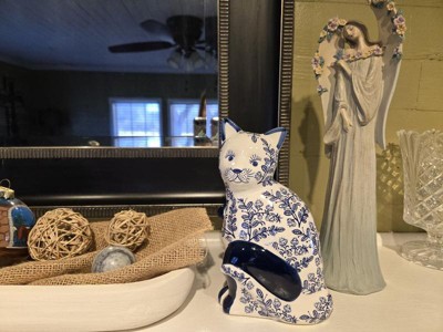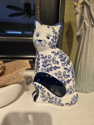 Decorative Ceramic Chinoiserie Cat for Home Decor - Modern Figurine for Bathroom, Office, and Living Room Decor - Blue & White