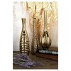 This trio set of glam vases are ideal as a stand-alone pieces for single long-stem flowers. Designed with felt or rubber stoppers at the base that prevent scratching furniture and table tops, as well as sliding around. This item ships in 1 carton. The slender design of this vase makes it ideal to hold a single flower stem, or as a decorative accent piece in your home. Suitable for indoor use only. This item ships fully assembled in one piece. This gold colored vase comes as a set of 3. Glam style. Vases have a 0.62 in, 0.50 in, and 0.62 in mouth openings.