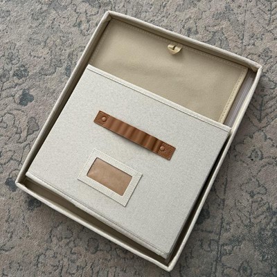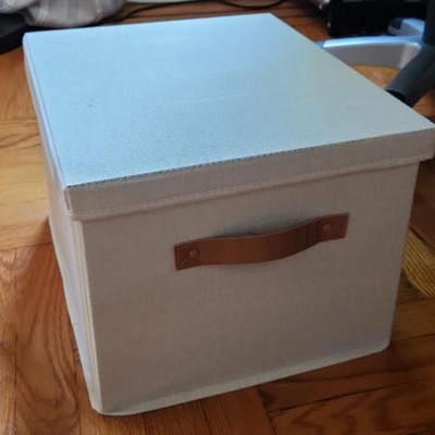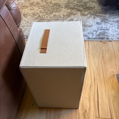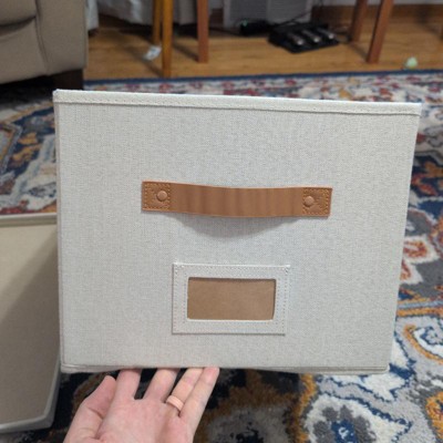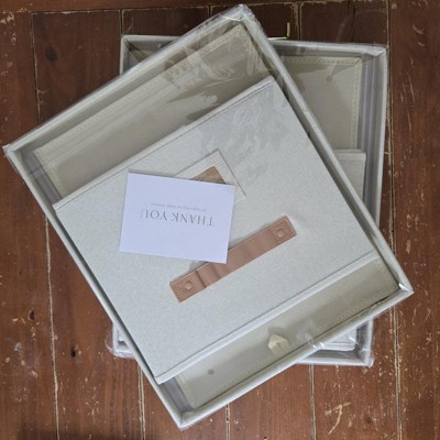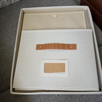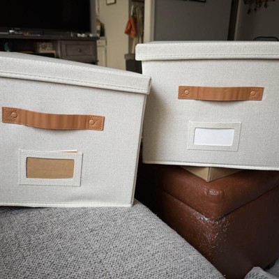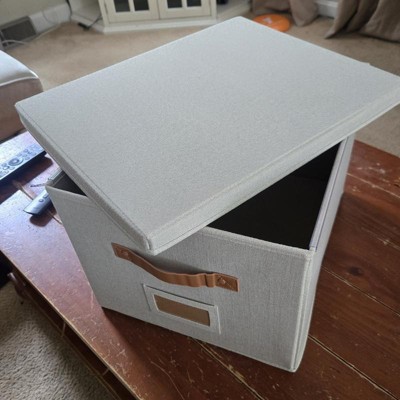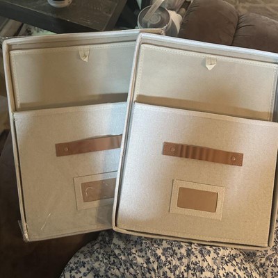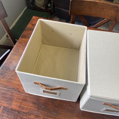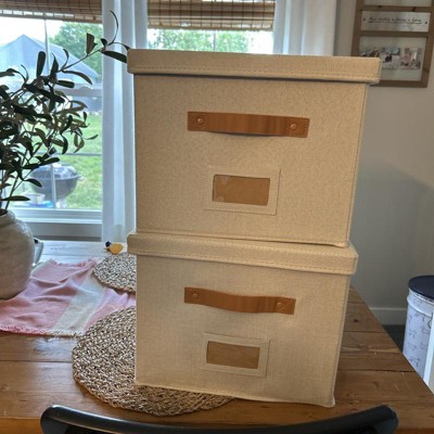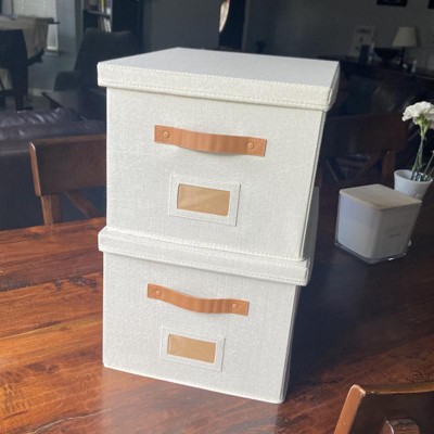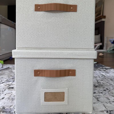 [This review was collected as part of a promotion.] These filing boxes were exactly as described. They are cute, simple, and neutral. They are larger than I expected but I’m happy with that! The color is bright and neutral and the straps are a brown leather. I was a little disappointed because one of the straps had some stickiness on it. They seem pretty sturdy and are very easy to put together! They could be used as a storage box or filing boxes! I received an incentive to write this review.