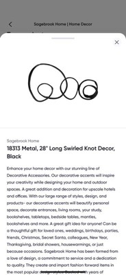 [This review was collected as part of a promotion.] Product Review: 18313 Metal, 28” Long Swirled Knot Decor – Black Honestly, I was disappointed with this decor piece. Although the size (28”) is decent for wall or shelf styling, the overall look feels cheaper in person than in the photos. The metal feels lightweight and not very durable—definitely not what I expected for the price. The style is modern, but the finish looks rushed and uneven up close. For the cost, I was hoping for something that felt more solid and high-end. Also, the packaging was very minimal. Mine arrived loosely wrapped with no real protection, and it had a few scratches right out of the box. Not worth the price, in my opinion.