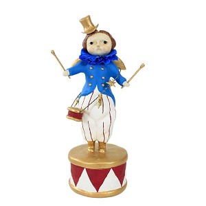 - Wearing a gold top hat, gold angel wings, and drum sticks in hand, proudly carrying a drum over his shoulder.