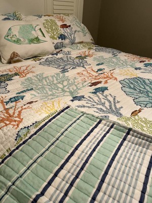 The Deep Sea Reversible Quilt Set by Levtex Home is inspired by beautiful ocean coral reefs. Featuring a blue, green, teal on white pattern, this machine washable quilt set includes the quilt and one standard pillow shams. Enjoy this for years to come!