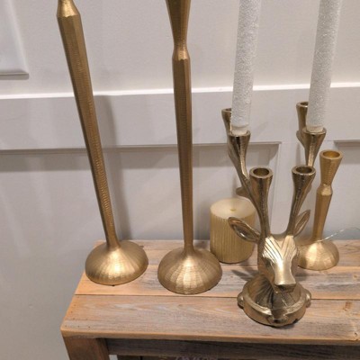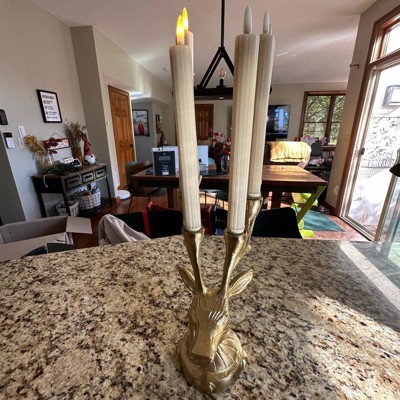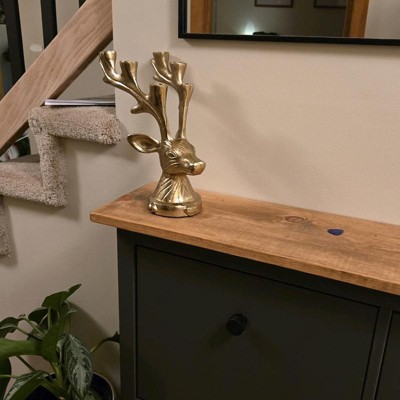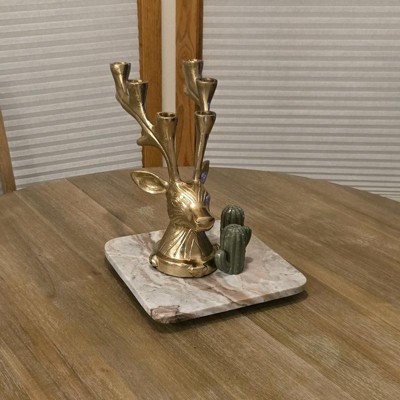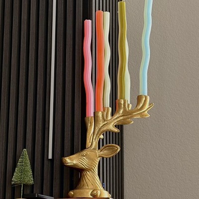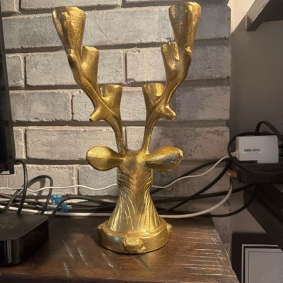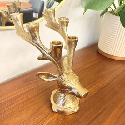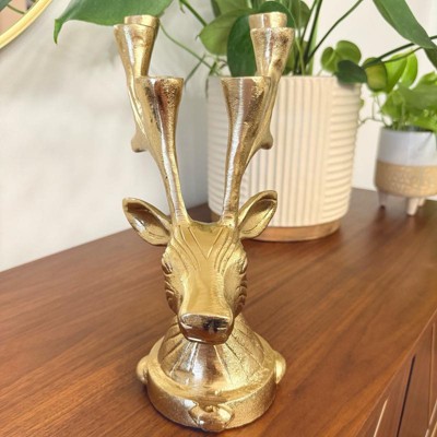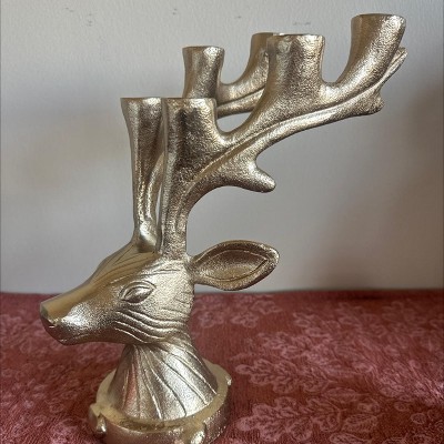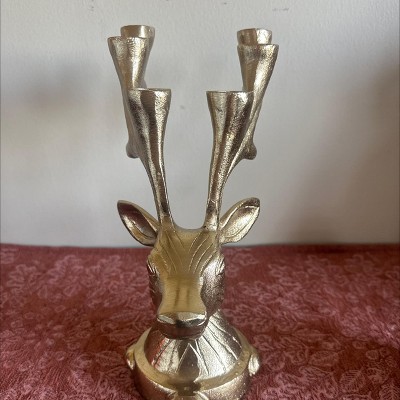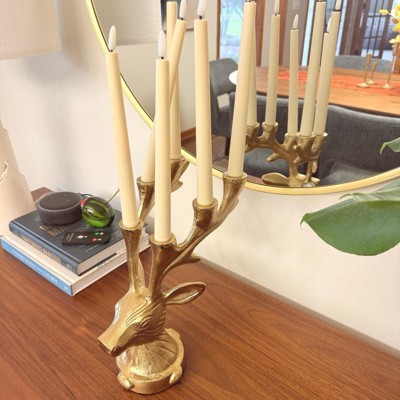 Elegant and functional, this Deer Candelabra from Threshold™ adds magical charm to your holiday setup. Made of metal, this gold-tone candelabra is designed in the shape of a deer head and features large antlers that act as candle holders. It has the capacity to hold up to six tapered candles, and it features an indented base for extra stability.