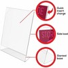Slanted, stand-up sign holder offers a convenient, effective way to display any message. Ideal for retailers, restaurants, trade shows and hospitals. Design is side-loading and self-standing. Portrait-style sign holder requires no hardware to install. Simply insert and set on counter or desktop. Transparent sign holder is made of durable, clear plastic.