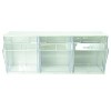 Deflecto® Tilt Bin® Interlocking Storage Bins, 6-Bin Unit, White | Tilt Bin® horizontal interlocking storage system allows you to stack and connect to form a custom modular system. Transparent bins tilt out and stay open while in use. Can be wall mounted or used on countertop. Identification labels and mounting hardware included. Bins can be easily removed from locking mechanism for cleaning and refilling. Includes 6 bins. Each bin measures 3-1/2"W x 3-3/4"H x 2-5/8"D. Unit measures 23-5/8"W x 4-1/2"H x 3-5/8"D.