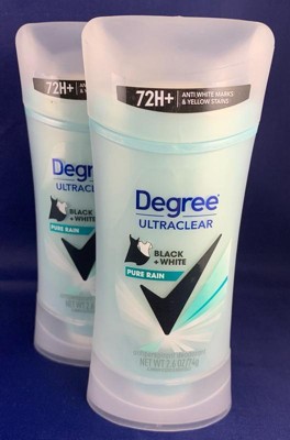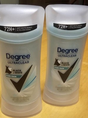 Degree Women UltraClear Black + White Antiperspirant Deodorant Stick helps protect against sweat while reducing white marks and yellow stains on clothing. Designed for everyday confidence, this antiperspirant delivers reliable wetness and odor control. The Pure Rain scent provides a fresh, clean fragrance that lasts throughout the day. The solid stick applies smoothly and dries quickly without residue. This value pack includes two 2.6 oz sticks, offering convenient, stain-defending protection with trusted Degree UltraClear performance.