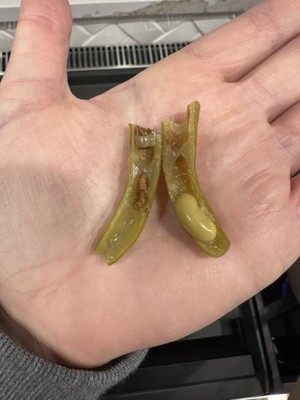 We’ve been eating this brand of green beans for years without an issue until I opened this can! WOW, wasn’t expecting to see a dark piece of rock thing in the can! We’ve gotten used to stems & end pieces. But not foreign objects!