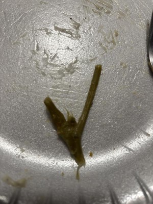 I bought these Green Beans about a month ago. I opened them for lunch today and I found this large hard stem. This is the second time I’ve found something nasty in their product. Don’t think I’ll be buying anymore Del Monte products.