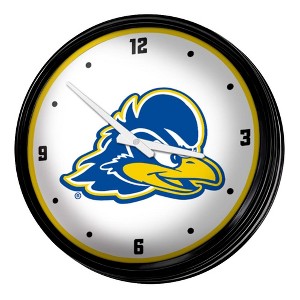 This premium University of Delaware Retro Lighted Wall Clock will be sure to add the finishing touch to any room in your home or office. This piece is injection molded and features a high-resolution, high gloss digitally printed face. Comes with an 8 foot power cord and an on/off pull switch for the light. LED illuminated. Hanging hardware and light bulb included. This is an officially licensed product of the Blue Hens and made in the USA.