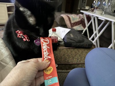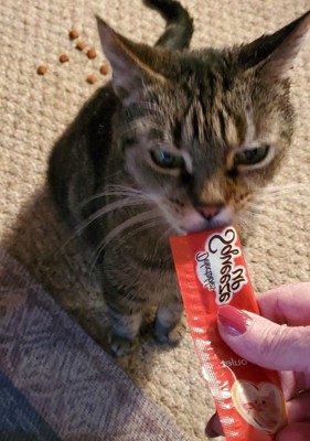 Our cats enjoy having a delectable squeeze up for a treat. They know what it looks like so when I grab one, they come running!