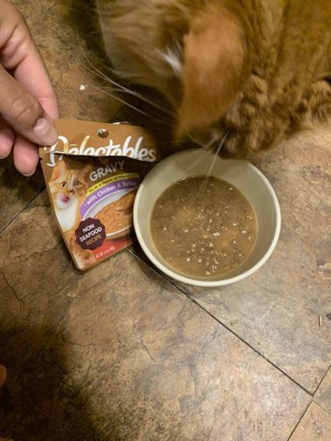 My cat loved this!! It's thick like actual gravy and full of tiny bits of meat. He does not want it over his food so he has it as a snack. I will definitely be buying this again for him!!
