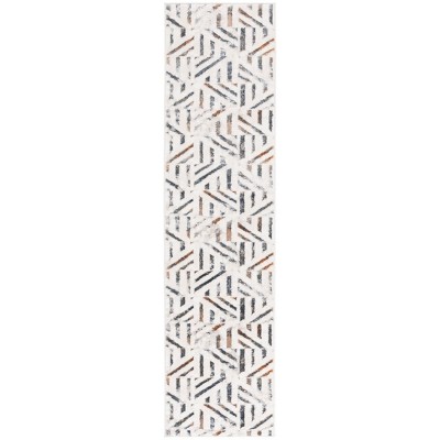 A: The rug features a graphic design with polka dots, chevron stripes, and geometric patterns.