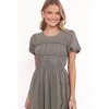 • A: The dress has short puff sleeves with elasticized cuffs for a stylish look.