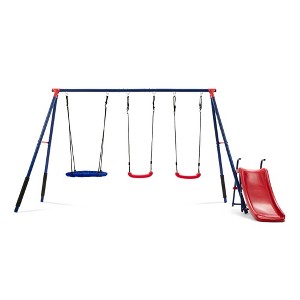 - Offers four exciting play options—two swing seats, a saucer swing, and a slide—for nonstop outdoor fun.