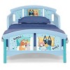 This Bluey Plastic Toddler Bed by Delta Children will have kids excited for bedtime. Colorful decals of fun-loving heeler pups from the land down under, Bluey and Bingo, makes this toddler bed is a must-have for any Bluey fan. The bed’s low mattress height and attached guardrails make it the best option for your child’s first big-kid bed, giving them the independence they crave while keeping them safe throughout the night. Get this toddler bed today and bring home the magic of Bluey! Bedding and mattress not included.