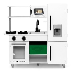Your aspiring chef can cook up elaborate meals with this Delta Children Deluxe Modern Kitchen. Made for hours of imaginary play, the detail-packed design includes knobs that turn and click, a working ice dispenser with cup and 2 ice cubes, and appliance doors that open and close. There's also a play oven, microwave and sink. With the Deluxe Modern Kitchen, kids can exercise their creativity, imagination, and real-world learning abilities individually or with others. The endless features allow kids to interact and mimic everyday kitchen tasks they see from adults. With sleek hardware, playful curves and a modern look, it's a thoughtfully designed piece for the playroom. Functional shelving and the recycling themed fabric bin provides plenty of convenient storage to stow everything away. Assembly is easy with the included step-by-step instructions and high-quality hardware.