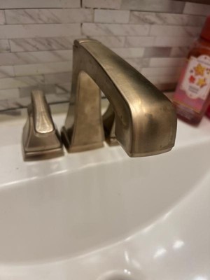 [This review was collected as part of a promotion.] This faucet is very aesthetically pleasing. The gold color is soft and doesn’t look overly embellished like most gold colored faucets. The finish is perfect on every piece. I removed my existing widespread faucet so I could install this one and upon trying to install the handles I was quickly made aware that it wouldn’t work on our pedestal sink. The plastic inserts you put in for the handles and faucet are about 1/8 inch too large and won’t fit in the holes. The only way to install it would be to have a contractor come in and bore the holes out. That wasn’t an option for me just to replace a faucet. If you buy this one, be aware that you may need to have those faucet holes enlarged to make this one fit. There is no measurement specifications on the box, either. I was disappointed because we really love the faucet.