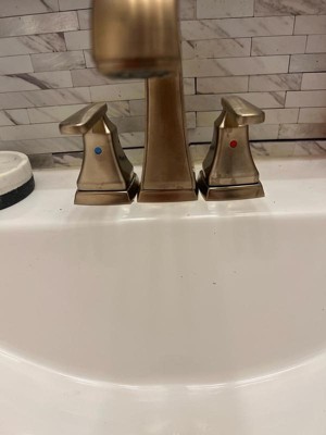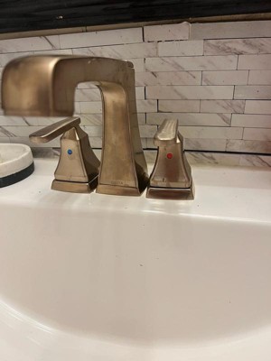 [This review was collected as part of a promotion.] This faucet is very aesthetically pleasing. The gold color is soft and doesn’t look overly embellished like most gold colored faucets. The finish is perfect on every piece. I removed my existing widespread faucet so I could install this one and upon trying to install the handles I was quickly made aware that it wouldn’t work on our pedestal sink. The plastic inserts you put in for the handles and faucet are about 1/8 inch too large and won’t fit in the holes. The only way to install it would be to have a contractor come in and bore the holes out. That wasn’t an option for me just to replace a faucet. If you buy this one, be aware that you may need to have those faucet holes enlarged to make this one fit. There is no measurement specifications on the box, either. I was disappointed because we really love the faucet.
