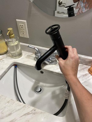 [This review was collected as part of a promotion.] Let me start off with saying the install was easy. Didn’t take us long to install this faucet. The water lines are very long though, which thinking is unnecessary but it’s a simple connection. The black is hard to keep clean from water spots but very modern and goes perfectly with our modern remodeling. The handle moves easily up and down plus installing the drain was very simple. The water pressure and non splashing of water, makes a nice smooth stream. I do need to mention the quality. This is a nice sturdy and heavy faucet, you can tell that upon opening of the box and throughout use. I’ll definitely be buying a second one for our guest bath.