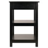 The table features a soft-close drawer with a silver accent pull and two open shelves that provide plenty of storage space. Made of composite wood in Black finish. Assembly required.