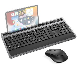 Enhance your productivity with the Delton T42 keyboard and M42 mouse combo, expertly designed for comfort and functionality. The full-sized 114-key wireless keyboard features a slim profile, numeric keypad, and 12 multimedia keys for easy access to shortcuts, while the tablet slot at the top offers convenient multi-device use. Paired with a wireless ergonomic mouse that includes six buttons for efficient navigation, customizable DPI settings (800, 1200, 1600), and precise optical tracking, this wireless keyboard mouse combo is ideal for extended work sessions. Enjoy seamless 2.4 GHz wireless connectivity with a 30ft range for both devices using a single USB dongle, ensuring clutter-free convenience.