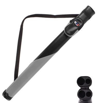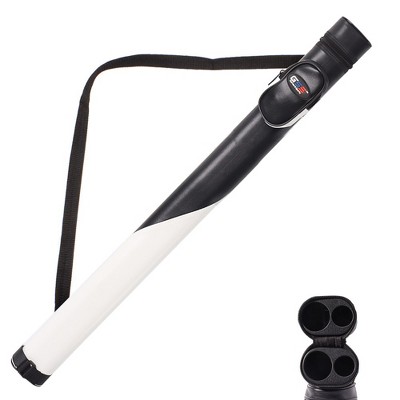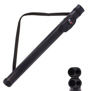 The 1x1 deluxe billiard cue case is designed with a hard leatherette covering from bumps and scratches, an adjustable shoulder strap for easy carrying, a slid-able zipper pocket, and an oval cross section, quality and durable. The inside of case is separated into 2 independent spaces to hold 1 butt and 1 shaft, and the soft felt-lined bottom cushions the pool cue if it drops. The pool stick case is perfect for a 2-piece cues measuring 58 inches or less.