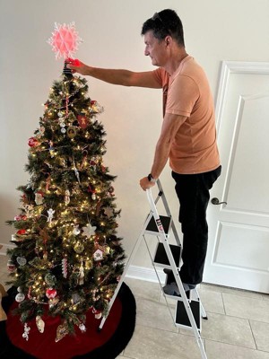 [This review was collected as part of a promotion.] This step ladder is very sturdy & stable. I have 12 ft ceilings in my house, so this step ladder is just the right height & has come in very handy. I was always grabbing a chair to stand on to do things around the house, which is not very safe. I felt much more safe on the ladder, it didn’t wobble or move around. My hubs also used it on the porch to put the Christmas lights up. It’s very easy to store, just fold it & put it where you want. We’re very pleased with this step ladder & will be recommending it.