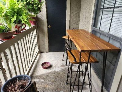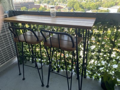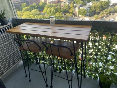 love the design! very trendy and cute for outdoors. super easy to assemble and sturdy. some fading with weathering overtime for being outside - would recommend putting a wood sealant on top if you don’t want that to happen. It is a little snug for 2 people but just right for a bar set on our balcony. versatile - used to for a dining table for 4 which was snug also but not terrible sizing for smaller apartments.