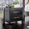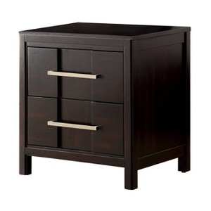Brighten your home with the chic appeal of this wood 2-drawer nightstand that is finished in espresso. The sleek wood-grain appearance adds intricate visual appeal to the spacious two drawers and their metal bar pulls. Both drawers feature sturdy English dovetails and side metal ball bearing glides for long-lasting durability while the felt-lined top drawer adds a protective layer for your delicate items. This nightstand is constructed from solid wood and wood veneers for strong stability.