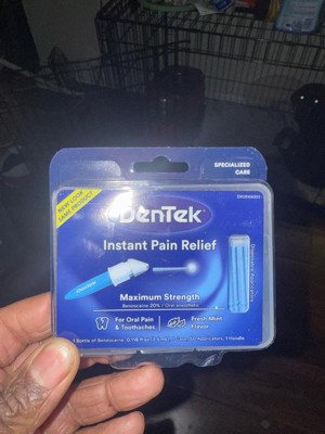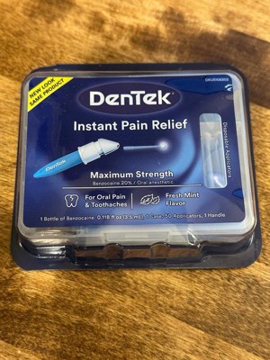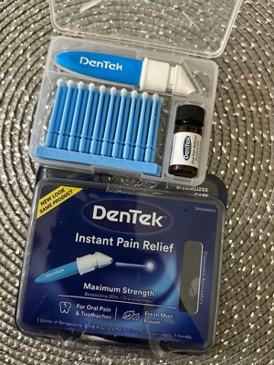 - DenTek Instant Pain Relief, Advanced Kit includes 1 bottle of Benzocaine (20%) 3.5 mL, 50 count disposable applicators, applicator handle and carrying case