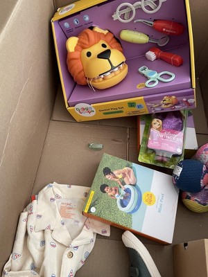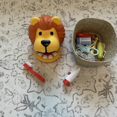 A: Hello Kim H - Thank you for your interest on - Dentist Play Set. This set includes 20 colorful pieces, including a toothbrush, dental drill and more. They can practice a dentist visit on the toy lion by pulling out its bad teeth and replacing them with good teeth. Plus, it comes with a storage bag to hold all the equipment. Hope this helps. - Rose