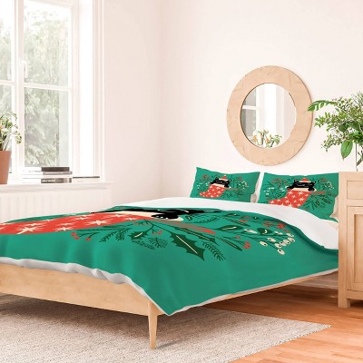 Deny Designs Full/Queen carriecantwell Festive Feline Comforter and Pillow Sham Green