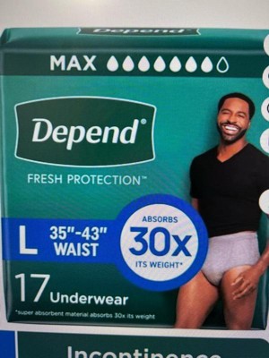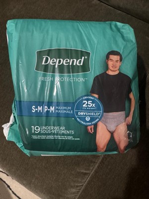 - DEPEND FRESH PROTECTION: 19 count of Depend Fresh Protection Incontinence Underwear for Men, size small/medium (26–34" waist)