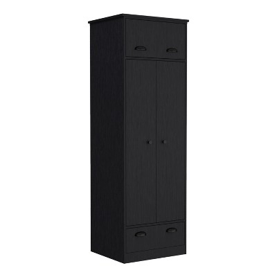 Introducing the Minto Armoire — where functionality meets flair. Its drawer, perfectly sized at 16.2"W x 3.9"H x 13.1"D, effortlessly stows away accessories. With three open shelves, each dimensioned at 15.7"H x 20.7"H x 13.2"W, showcase your possessions. Beneath the sophisticated double doors lie two resilient metal rods, poised for your apparel. All encased in a refined white or black manufactured wood finish, making it the must-have ensemble piece for every modern bedroom. Dimensions: Height: 71,65" Width: 35,43" Depth: 49,5" Furniture Type: Ready to assemble (full assembly required). Certifications: CARB phase II compliant – TSCA Title VI Compliant. Warranty: 1-year warranty coverage in wooden parts- 1-year warranty coverage in hardware pieces since its manufacturing date found in the lot number printed in the product box.