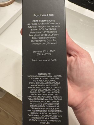 water (aqua), ammonium lactate, cetearyl alcohol, glycerin, c12-15 alkyl benzoate, ethylhexyl palmitate, prunus amygdalus dulcis (sweet almond) oil, glyceryl stearate, peg-100 stearate, pentylene glycol, cetearyl glucoside, hydroxyethylcellulose, dimethicone, potassium sorbate, allantoin, xanthan gum, sodium benzoate, sodium stearoyl glutamate, caviar extract, disodium edta, ceramide np, ceramide ap ceramide eop, phytosphingosine, cholesterol, sodium lauroyl lactylate, carbomer, tocopheryl acetate, hydrolyzed milk protein, phenoxyethanol, fragrance (parfum)' '