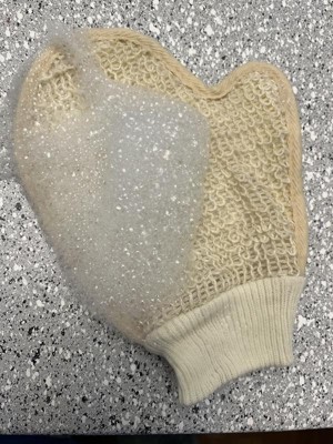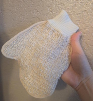 This is my first time using a product like this and I was underwhelmed. One side is soft and the other is rough, but since it is a glove, I can only use the rough side with one hand, in which I can't reach all parts of my body with the rough side. If I switch it to my other hand, then I can only reach certain parts of my body with the soft side. This also had a chemically smell to it, even after multiple uses. The glove also turned yellow in some parts after only one use.