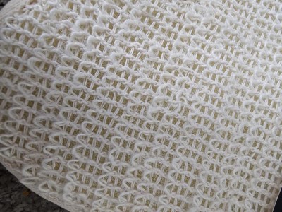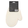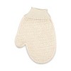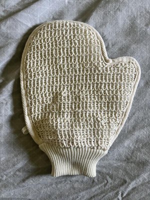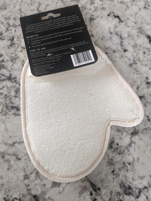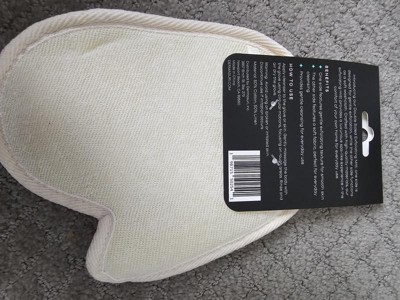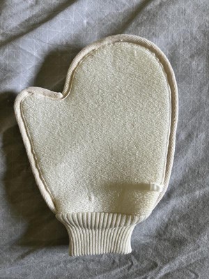 Very nice! I've not used one of these in years and so was excited to try this one. This is super nice to use. Love the cuff on it that holds it securely on. The texture on both sides is great. I tried to get some close-up photos of it to show how really good it is. The exfoliating side is gentle, as it says, which is great. No scratching the skin!! Gets your skin feeling so smooth and soft. Materials in this are 50% cotton and 50% linen. It easy to use and gets your skin clean and feeling great. Very pleased with it.