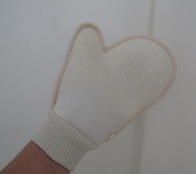 Apply cleanser to the glove or skin. Gently massage the body with the glove using circular motions, focusing on rough areas. Rinse and air dry the glove.
