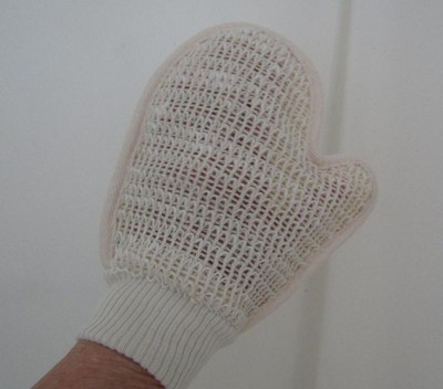 I liked this wash cloth / exfoliating glove. It was easy to use. This glove fits well, a bit big but not too bad. One side is mesh and the other side is thicker. It isn't too harsh for my skin. I love to use the exfoliating glove on my legs before shaving to help remove and prevent ingrown hairs.