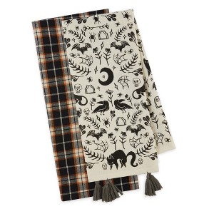 The Occult Dishtowel Set of 2 from our Hallow's Eve Collection includes one of each style dishtowel shown, designed with corner hanging loop, sewn in care labels and are made from cotton. Set is comprised of one printed plaid dishtowel and one printed dishtowel embellished with decorative tassels at the hem.