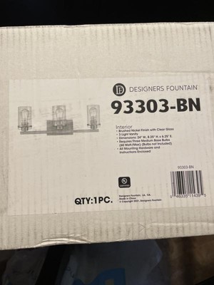 [This review was collected as part of a promotion.] This "Designers Fountain" light fixture has a simple, clean, contemporary design with a nice brushed nickel finish and three glass globes, bulbs not included, cast a warm light. The installation will be easy with only three wires to connect. The weight is lot lighter than I expected, but the fixture is well constructed. This will be a nice addition to my bathroom remodel once the walls are painted and my sink and cabinets are replaced.